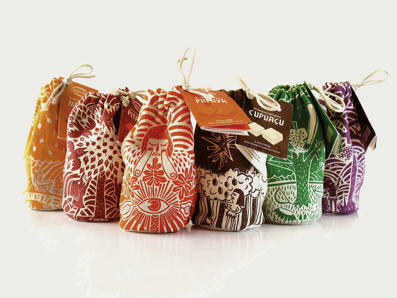 Below you can check out the single flavours packages. They were made to represent the brazilian indians fabric hand bags.