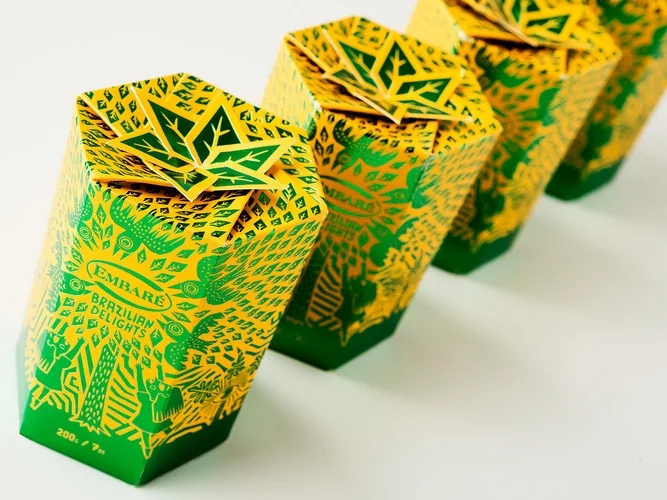 Embaré is one of the largest dairy companies and a leader in milk caramels in Brazil. The name, Embaré, means "tasty tree" in the Tupi Guarani language . It's new release is the Brazilian Delights caramels. It includes milk caramels in six brazilian typical fruits flavours : açaí, mango, pitanga, papaya, cupuaçu and graviola. For the creation of packaging the strong sense of the Brazilian tradition in the product and in the origins of its flavours were exploited. This is the promotional package.