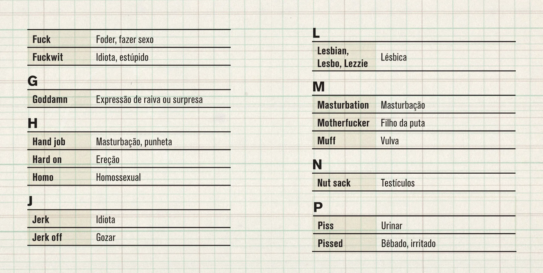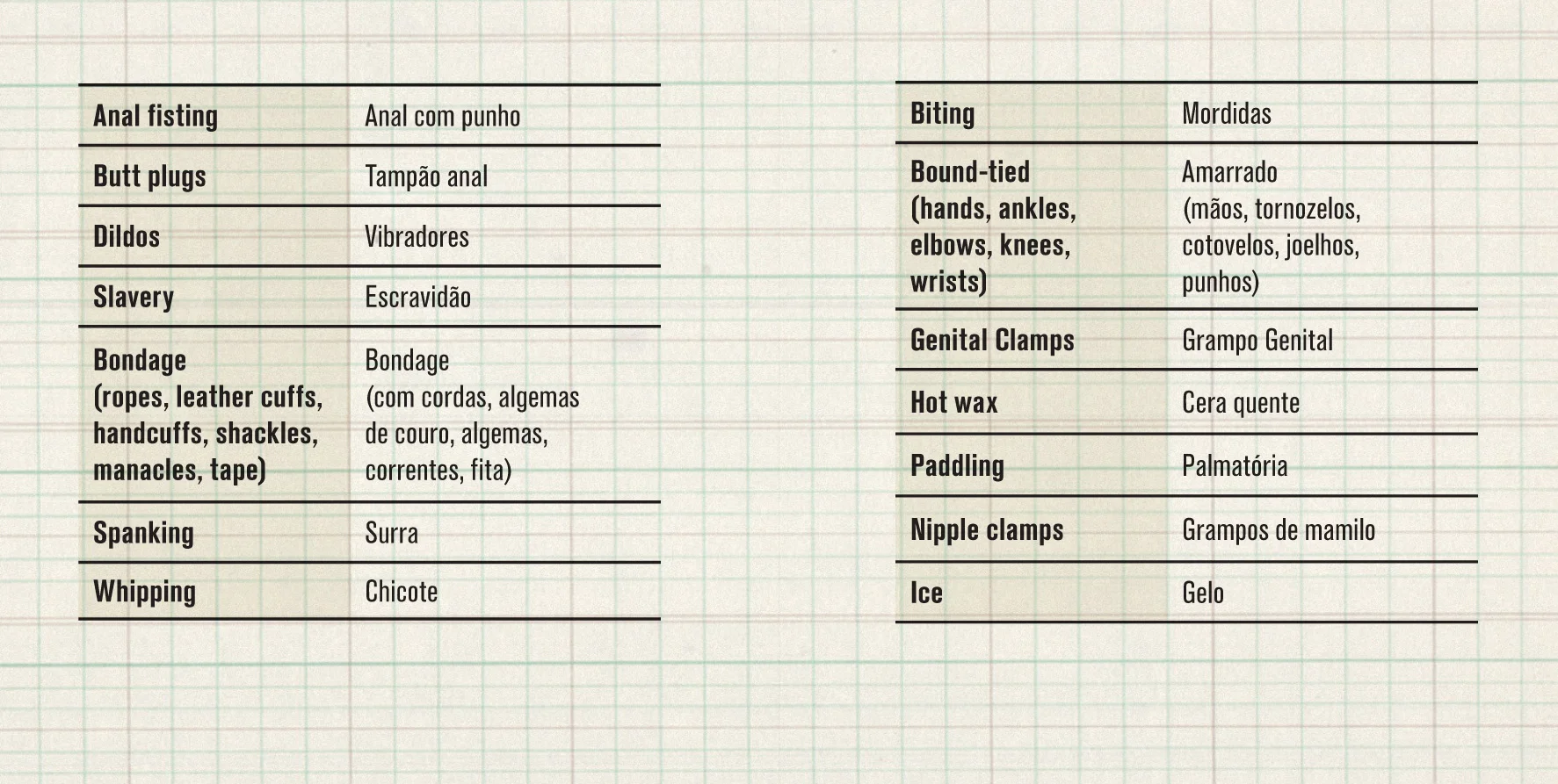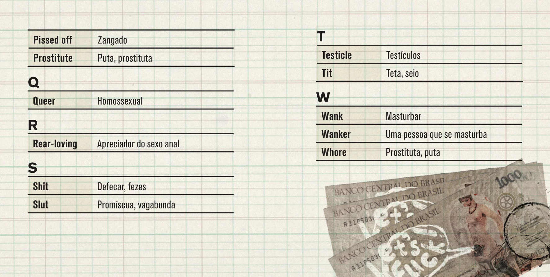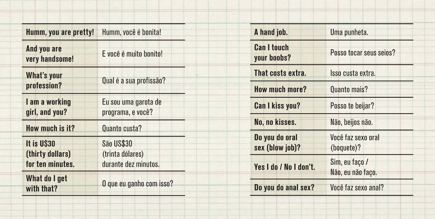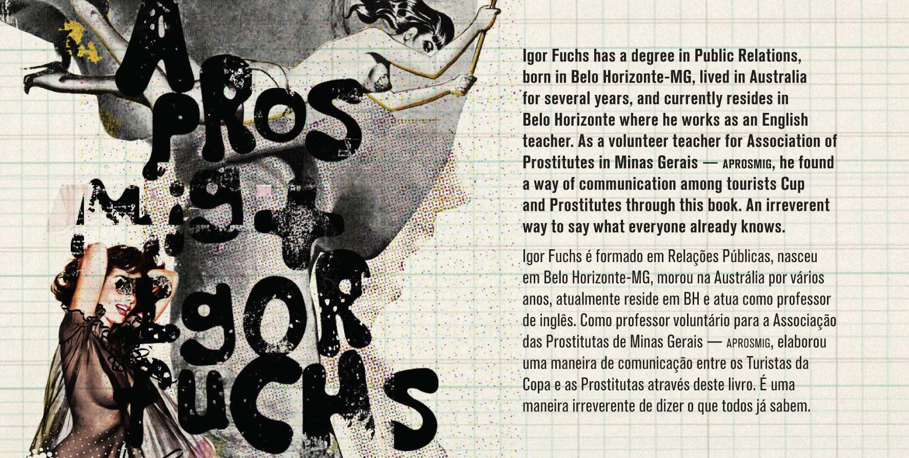 In 2014, the Brazilian states were preparing for the arrival of tourists for the Football World Cup. With this in mind, the English teacher Igor Fuchs in partnership with Aprosmig - Association of Minas Gerais Prostitutes - created "The Bitch's Book". The book contains common sex phrases in Portuguese and English to facilitate the communication between tourists and prostitutes.